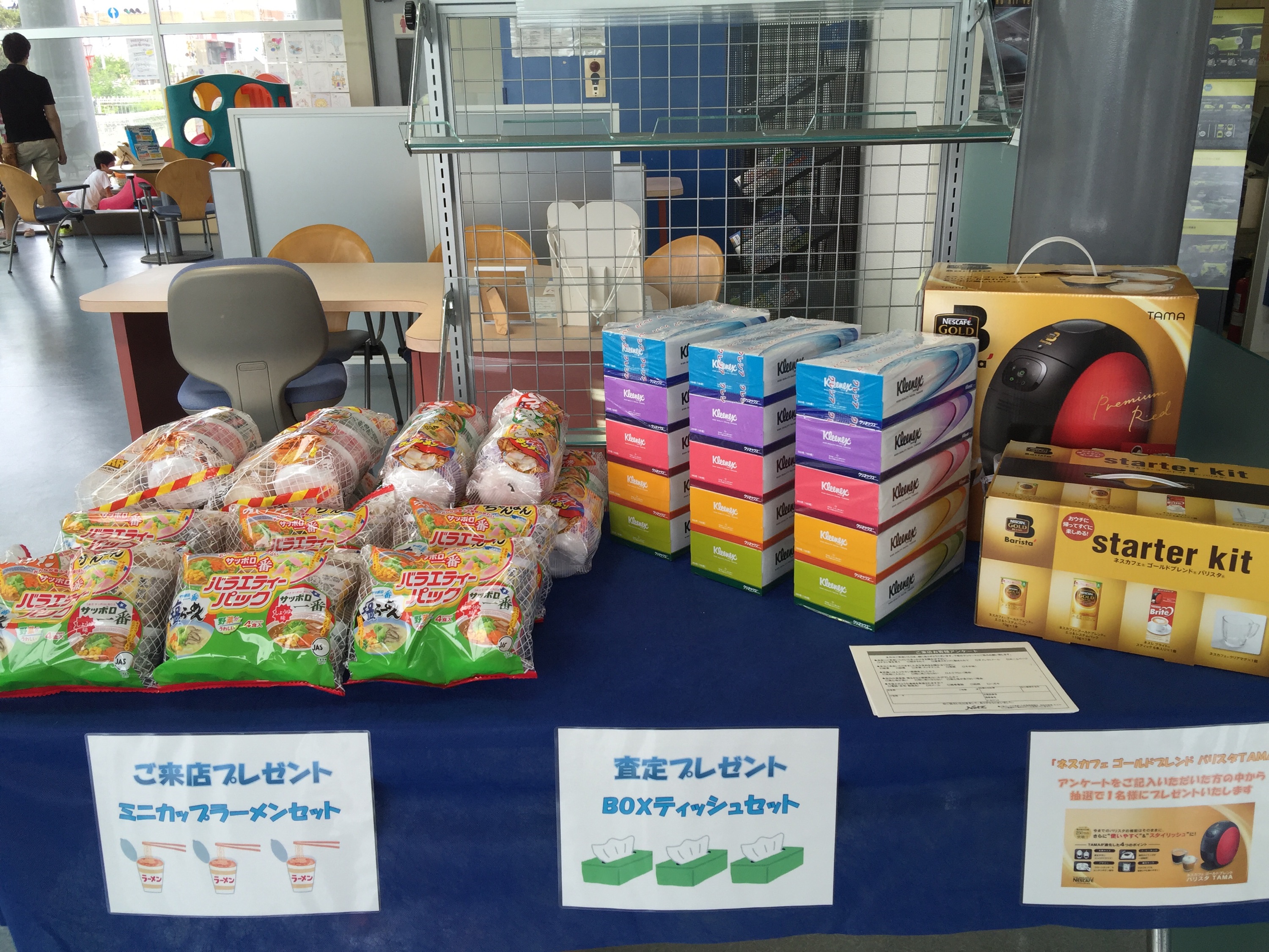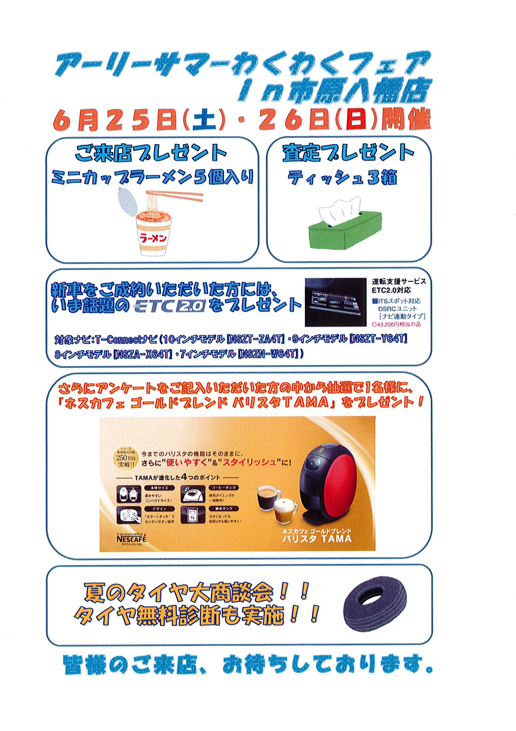 ☆ご来店いただいたお客様に、 ミニカップラーメン5個入りをプレゼント ☆お車の査定をしていただいたお客様に、 ティッシュ3箱をプレゼント ☆新車と対象のナビをご成約いただいたお客様に、 ETC2.0をプレゼント(対象ナビ:T-Connectナビ) ☆夏のタイヤ大商談会 ご入庫いただいたお客様に、タイヤ無料診断を実施 ☆アンケートをご記入いただいた方の中から 抽選で1名様に、ネスカフェ バリスタをプレゼント