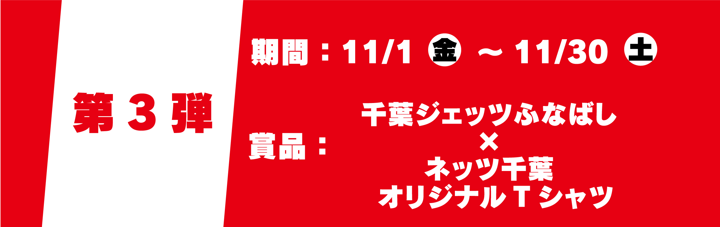 11/1(金)~11/30(土)までの第3弾は 「千葉ジェッツ×ネッツ千葉 オリジナルTシャツ」が 抽選で20名様に当たります♪ ※ネッツトヨタ千葉全店合計数
