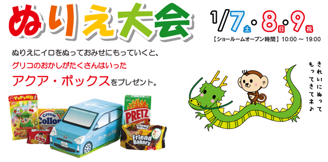 同時に「新春恒例!ぬりえ大会」も開催(`・ω・´) ぬりえをご持参のよいこには、お菓子がいっぱい入った、『アクア型のお菓子BOX』をプレゼント!
