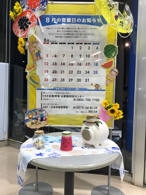 ・・・お知らせ・・・ 今月13日(月)~17日(金)までの間、 誠に勝手ながら夏季休業とさせていただきます。 期間中、緊急に際には下記までご連絡ください。 〇営業している全国トヨタ販売店の店舗のご案内は、 トヨタ自動車㈱ お客様相談センター 0800-700-7700 (開設時間 9:00~18:00) 〇事故・故障でお困りの際は、 JAF(日本自動車連盟) 0570-00-8139 または、短縮ダイヤル #8139
