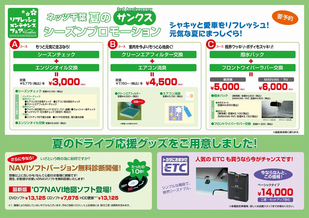 ただ今ネッツ千葉では夏のサンクスシーズンプロモーションを実施中!!A・B・Cの3コースをご用意。夏に向けてお車のリフレッシュしませんか?お子様には「ハメパチ君」をプレゼント。ご来場お待ちしております。