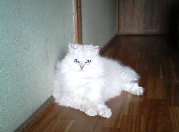 ボクがお伺いしたら暑さの為、廊下で くつろいでました。 チンチラって種類の「シジミちゃん」です。 女の子です。年齢は十歳を超えたくらい。 (レディーは年齢を忘れるらしい?) ご覧のとおり体毛はフワフワ。特にお風呂 上がりは最高だそうです。 幼い時は活発で家中を爪でガリガリ。 玄関がちょっと開くと脱走したり大変! だったらしいですが、最近は年齢のせいか おとなしくなったそうです。 また体毛も全身真っ白だったのに、少し グレーが混ざってきたそうです。 大人の魅力でしょうか。