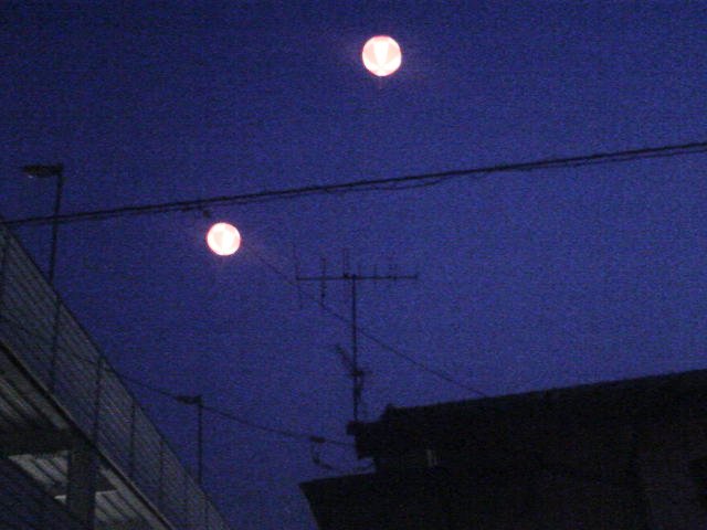 夜、営業から帰って空を見たらビックリ!! ええ~~アドバルーンが光ってる!? これが証拠の写真です。ねっホントでしょ。