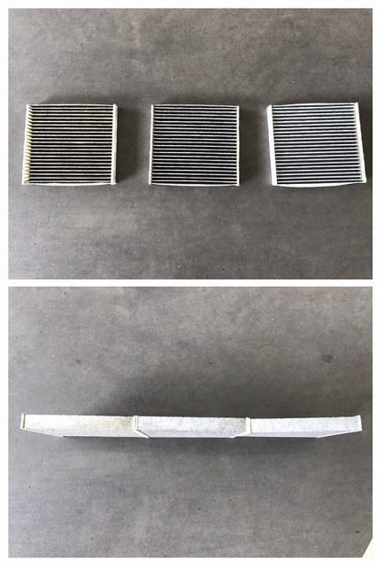 前回、使用済みのエアコンフィルターをご紹介できなかったので 今回は使用済みのフィルター写真をお見せします! 右から新品、禁煙車、喫煙車のエアコンフィルターです。 並べてみると色の違いが一目瞭然! 喫煙車のフィルターはなんと交換して1年も経っていません! タバコのヤニでこんな黄ばんだ色になってしまうんです((゚д゜;))) 交換時期は『1年または走行距離10,000km』を推奨していますが、 環境や使い方によって汚れ方も変わってくるので、 定期的な交換をオススメしております。