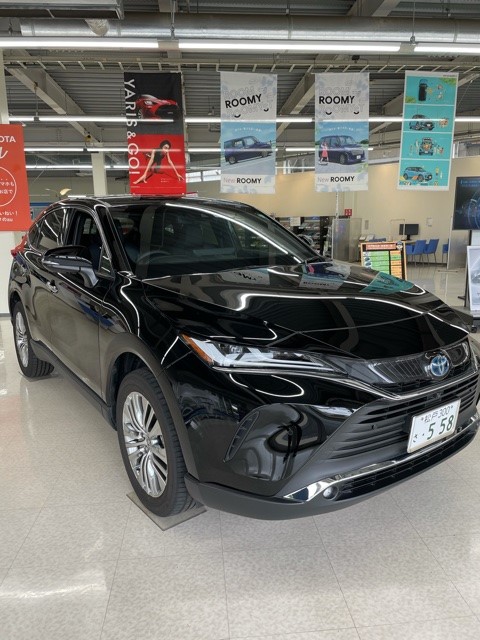 こんにちは~♡ジメジメした日々が続いています(><)湿気がすごくて嫌になっちゃいます!!これから梅雨時期がくるんですね☂☂☂洗濯物が全然乾かないのが困っちゃう季節です☺✨店内の展示車が変わりました☺☼ ** HARRIER **まさにこれからのSUVと呼ぶに相応しい佇まい。安定した走りを予感させるワイドスタンドに、低く伸びやかなフード、絞り込まれたボディからなる流麗なプロポーション。そして、それをしっかりと支えるホイールまわりの立体は力強く大らか。さらに映り込みや見る角度によって表情を変え、躍動感を生み出す画質には、さりげないセンスをも感じさせるハリアーは生まれ変わりました。たくましく、よりエレガントに。大人であるあなたの感性に、もっと強く訴えかけるために。すべてのハリアーは、あなたとつくる物語を待っています。ハイブリッドでカラーはブラック《202》です!試乗車としてご準備しておりますので、乗ってみてくださいね♡♡♡