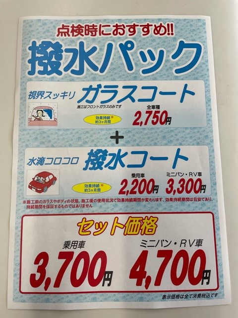 こんにちは~♡本日は風が強いですw(x0x)w強風です!!!ドアの開閉の際は気を付けて下さいね☺☼雨の日にオススメ☂☂☂ ** 撥水パック **視界スッキリ!! 『ガラスコート』全車種2,750円(税込) +水滴コロコロ!! 『撥水コート』乗用車 2,200円(税込)ミニバン・RV車 3,300円(税込)☺✨☺✨ セツト価格 ☺✨☺✨ 軽自動車・コンパクトカー 3,700円(税込)ミニバン・RV車 4,700円(税込)※効果持続 約3ヶ月間是非お試し下さい(^^)/