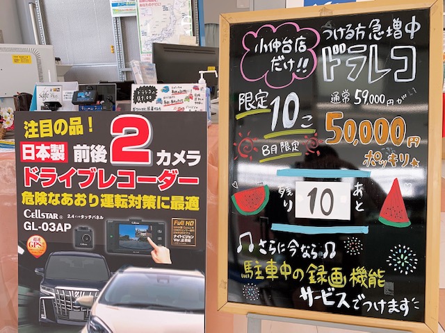 さっちゃん。から お得なお知らせ でございます♥小仲台店限定!! 10台限定!! 8月限定!!ドライブレコーダー 通常59,000円のところ工賃込 50,000円 でつけていただけます!!!ここ最近ドライブレコーダーをつけられる方急増中でございます。いざというときの為 ご自身の為に ぜひこのお得な機会にお車に装着しませんか??ヽ(^o^)丿