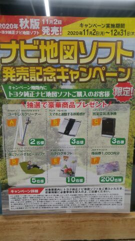こんにちは~♡2020年 秋版 トヨタ純正ナビ地図ソフト11月2日 に発売になりました❤キャンペーンも実施しております!!期間が2020年 11月2日 ~ 12月31日まででございます♪♪ナビ地図ソフト 発売キャンペーンとしてキャンペーン期間内に、トヨタ純正ナビ地図ソフトご購入のお客様限定!!抽選で豪華賞品プレゼントしております(^^)/行楽シーズンでお出かけされる際に是非おススメ❤❤スイスイ快適ドライブが出来ると思います❤❤