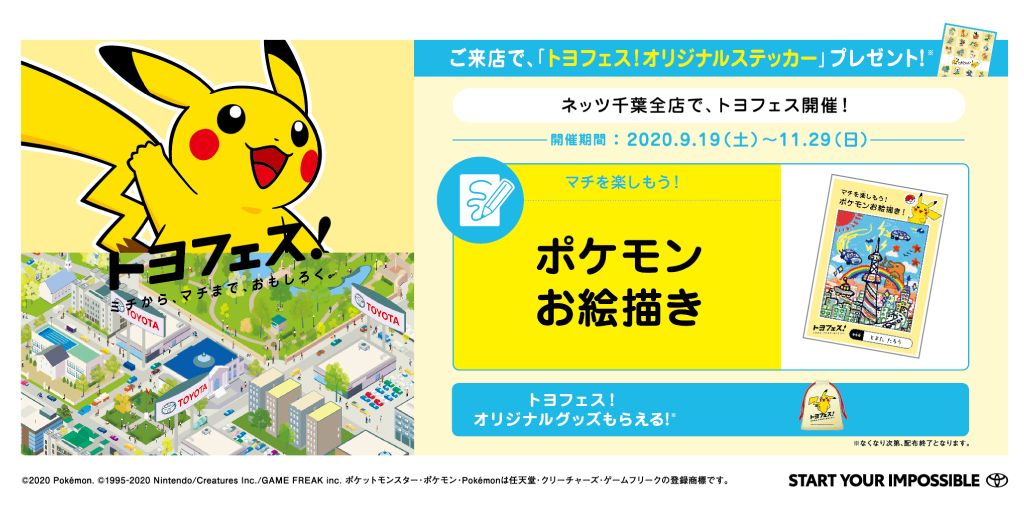 ☆トヨフェス開催中☆期間:9/19(土)~11/29(日)[予定]◇期間中、ご来店いただいた方に「トヨフェス!オリジナルステッカー」をプレゼント!◇期間中、「マチを楽しもう!ポケモンお絵描き!」にご参加いただいた方には、「トヨフェス!オリジナルグッズ」をプレゼント!あなたの住むマチを面白くするアイデアを出してね!詳しくはこちら!