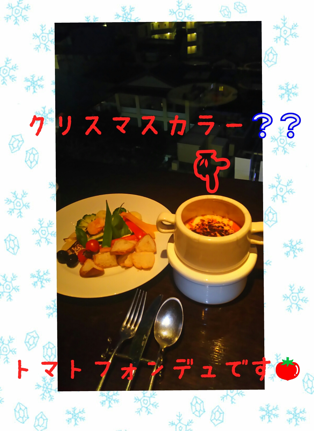 さて、今日の一枚はクリスマスにちなんだ(?)赤い物♬ 以前、神楽坂のレストランで食べた『トマトチーズフォンデュ』です☆ トマトの酸味でさっぱりと食べられてとても美味しかったです♥