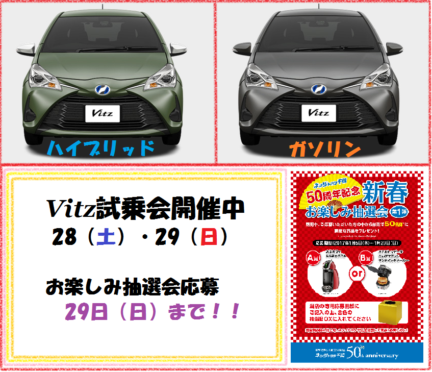 28日(土)・29(日) 新Vitzの試乗会です♪♪ 待望のハイブリッド登場に、乗ってみたい方も 多いのではないでしょうか!? 古市場店には
