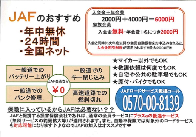 いざって時に、本当に助かります! JAFの申し込みは、古市場店ですぐに出来ます! そして、すぐに使えます! ぜひ、お休み前のご加入をご検討ください❤