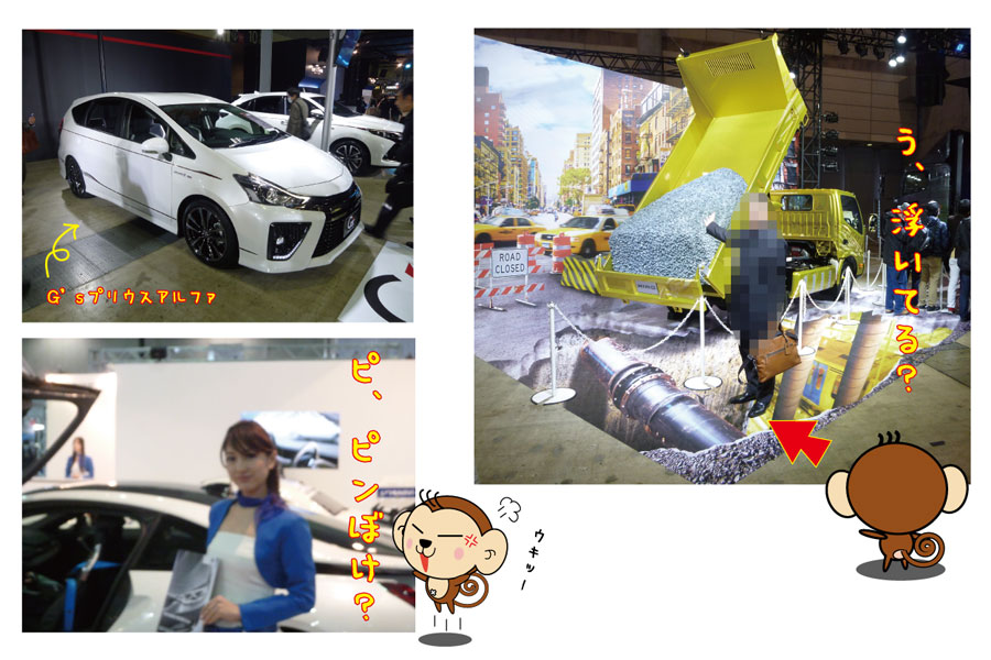 さっそく写真を見たところ。。。。。。 トヨタブースから始まり、写真右の、まるで宙に浮いているような写真が 撮れるトリックアートがあり、(おおっ楽しそう!) そして、カスタマイズカーがチョイチョイと。。。