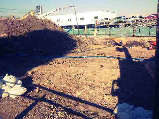 ~市川インター店☆新店舗ができるまで~レポート7☆「土の山」の裏側はどうなっているのか。。。写真を撮ってきたんですが、光の具合で影がだいぶ映りこんでしまい。。。さらに穴を掘っている所が遠いので見づらく、何がなんだかわからない写真になってしまった。。。すみません☆もっと上手に写真撮れるよう次回からがんばります!!