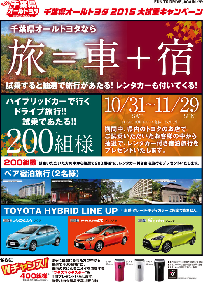 昨日お伝えした、千葉県オールトヨタ2015大試乗キャンペーンですが、なんと...外れてしまった方にWチャンスもあるんです(●^o^●)