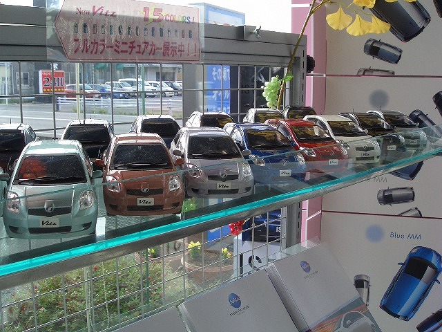 10月より成東店にヴィッツがフルカラー(15色)展示中です。ごめんなさい、ミニチュアカーなんですけど ^^; ヴィッツのイメージが少しでも伝わればいいなと思います!! 人気のある色は、メインカラーでもあるライトパープルマイカメタリック(薄紫色)です。私も好きな色です☆