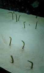 私が好きな生物はチンアナゴという 海水魚です! 沖縄の美ら海水族館で出会いました♪ 犬のチンに似ていることから その名前がついたそうですが 体長は40cmくらいで敵がくると穴の中に 隠れてしまう臆病者なのです! その穴からニョロニョロと出たり入ったり 可愛いいんです♥