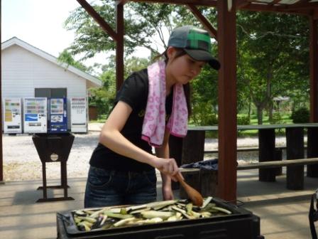 晩御飯に「茄子」を使った料理、「茄子の煮浸し」や「麻婆茄子」なども身体を冷やす料理としてお薦めです。 写真は「麻婆茄子」を製作中の「なっちゃんせんせい」です。 茄子を炒めるのは… 上手でしたよ(^^;