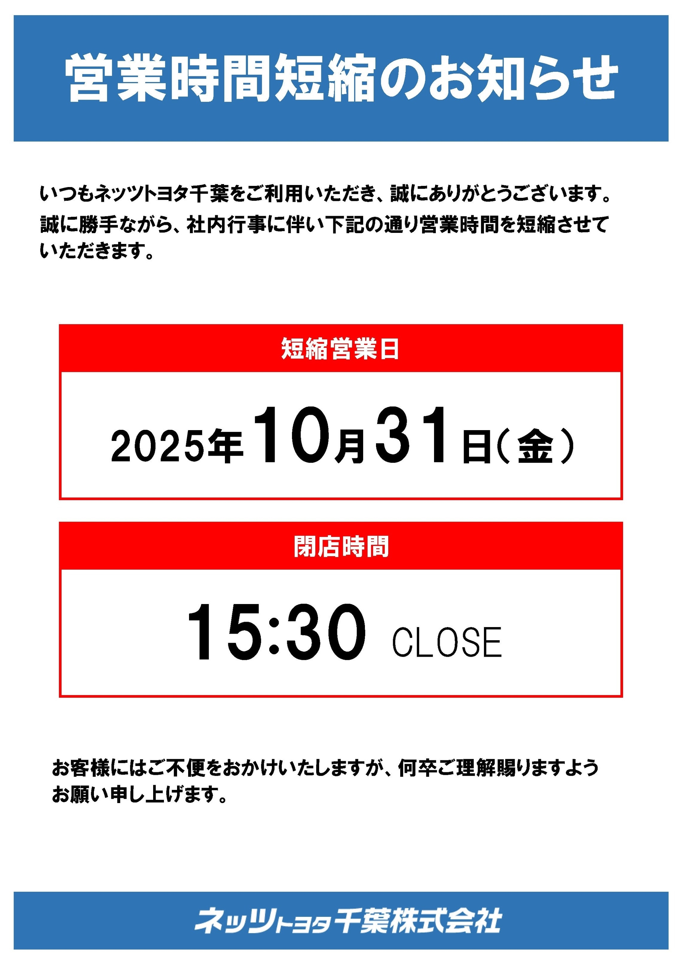 10月31日のみ営業時間を短縮させて頂きます。