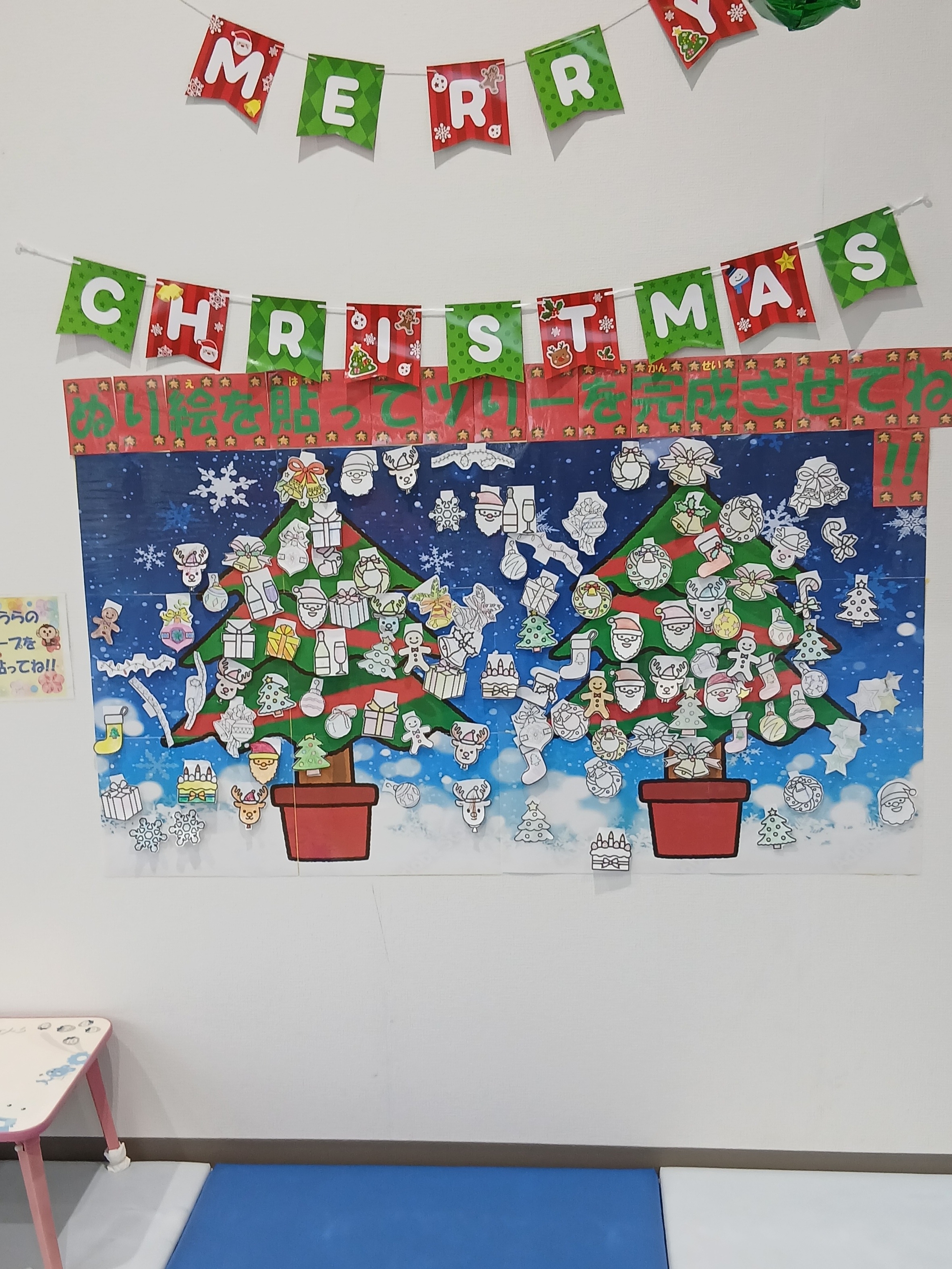 クリスマスツリーにたくさん塗り絵を貼って頂きにぎやかなツリーが出来ました。