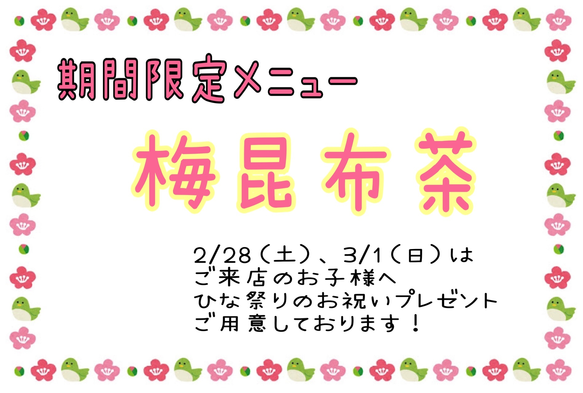 今週末から・・・!!! 2026.02.19 こんにちわ!! またまた期間限定ではありますが・・・ 今回は・・・・梅昆布茶です!!! 2/28、3/1の土日はお子様へひな祭りのお祝いプレゼントもご用意しております!! お楽しみに・・・!! 前の記事へ 店舗ブログ一覧に戻る 次の記事へ