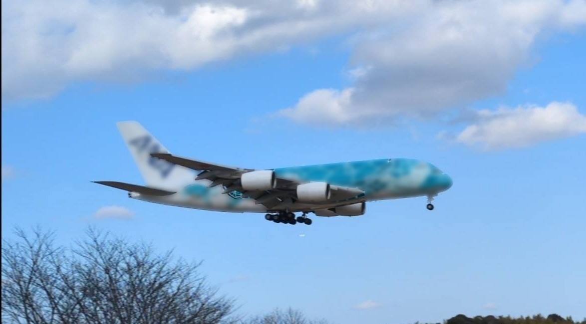緑の亀のペイントがかわいらしい大きな飛行機でした。