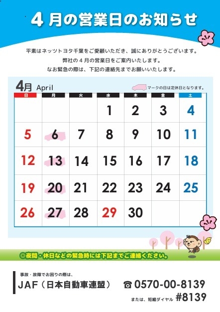 皆さんに4月の営業日の